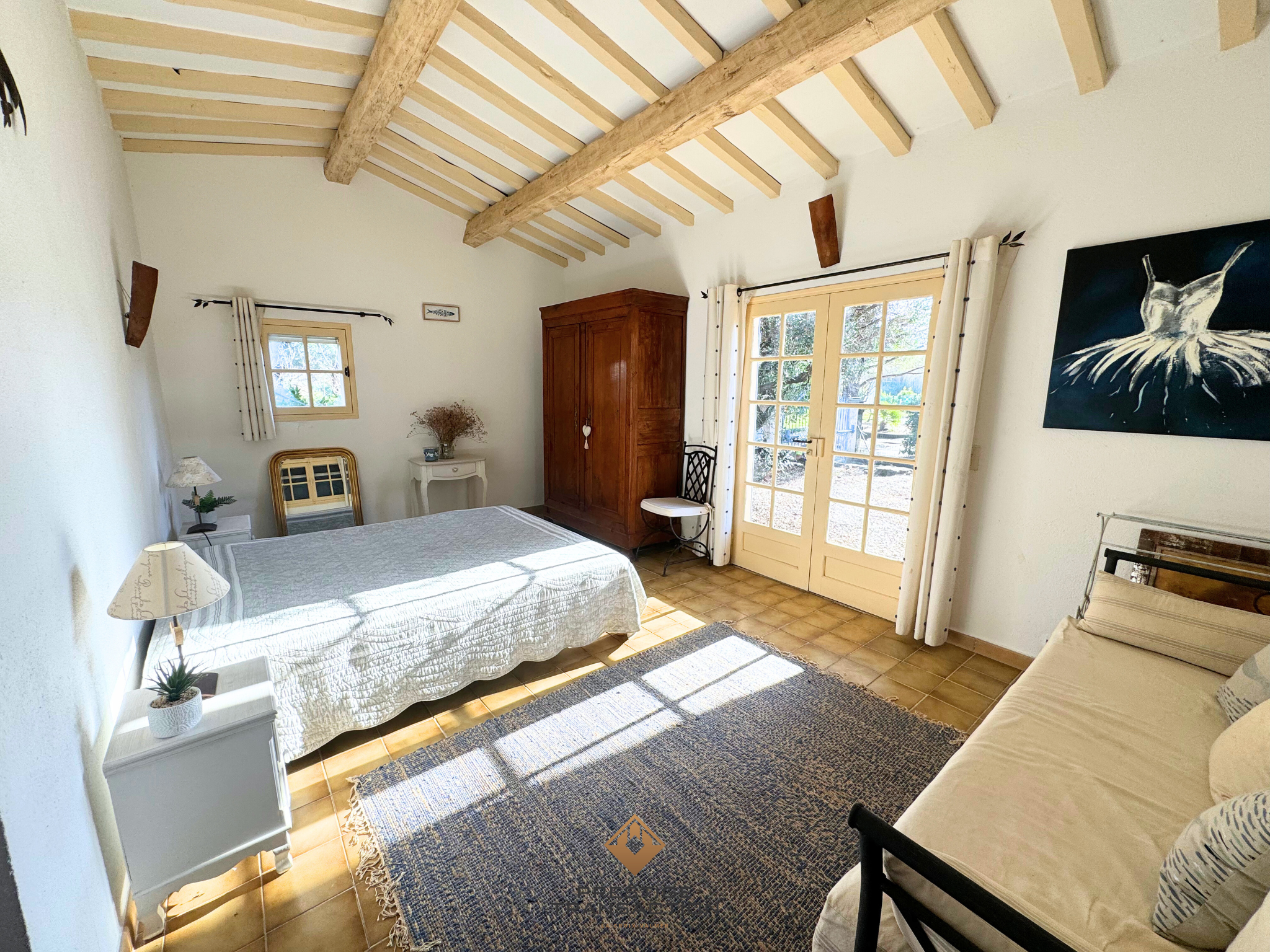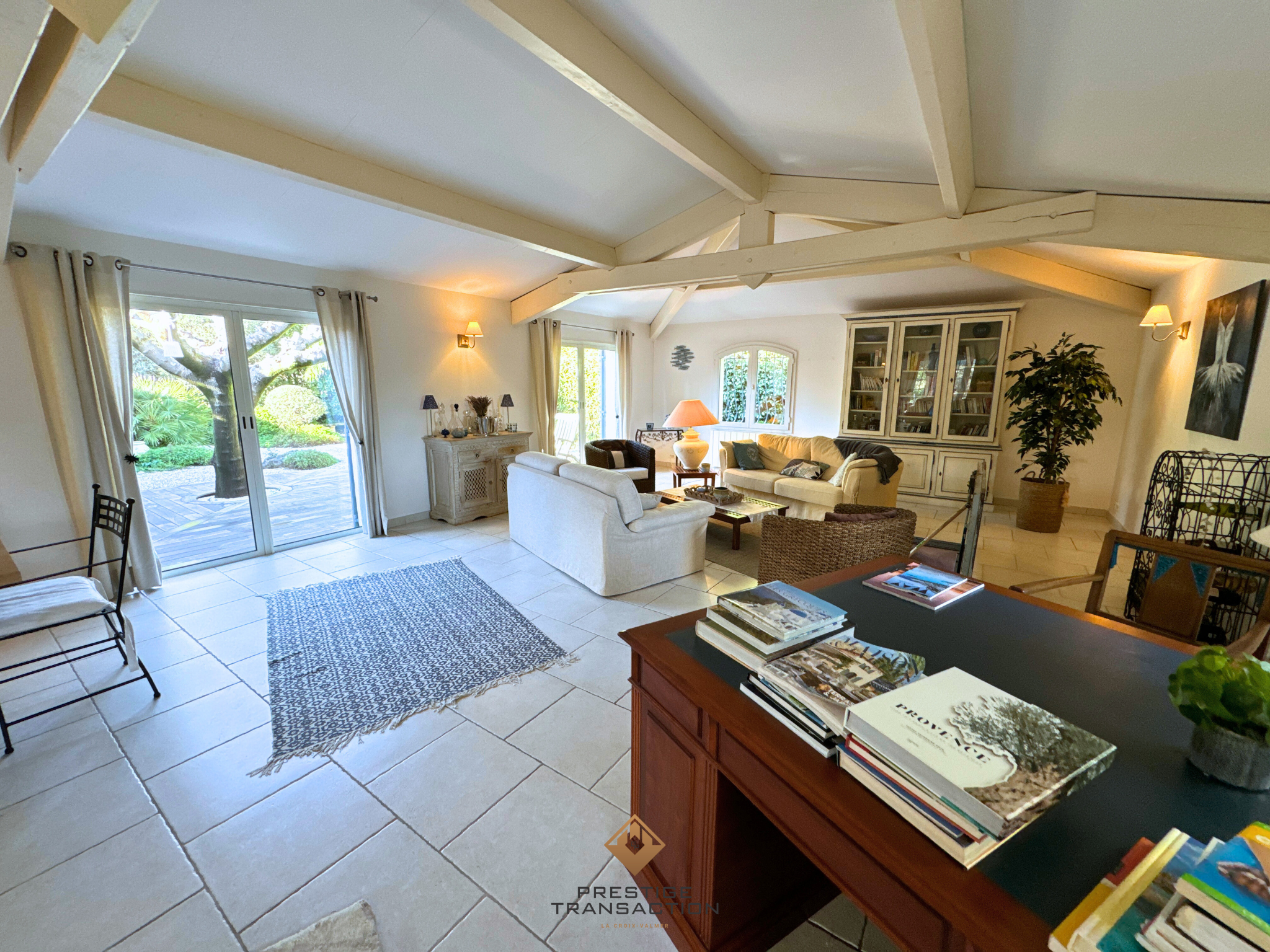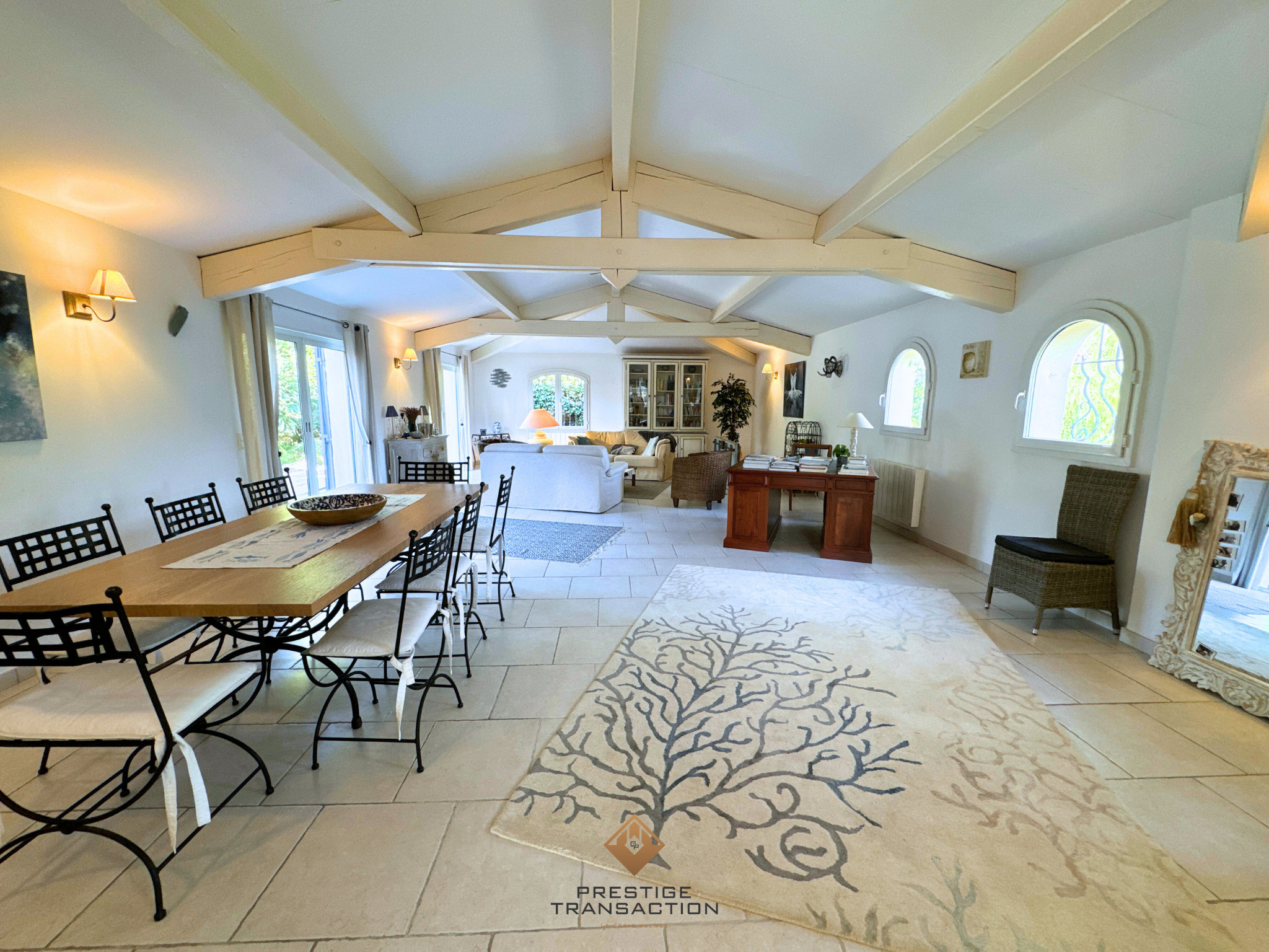 Une entrée accueillante s’ouvrant sur un séjour spacieux de plus de 100 m2, baigné de lumière grâce à sa quadruple exposition, agrémenté d’une cheminée et de poutres apparentes. Ce bel espace donne directement accès à plusieurs terrasses et au jardin.